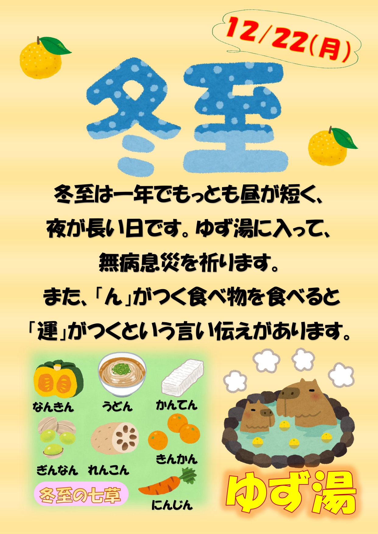 冬至と言えばゆず湯!ということで、皆さんにゆずの香りを楽しんでいただきました。