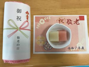 おやつには厨房手作りの紅白羊羹でお祝いです。