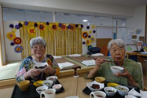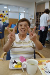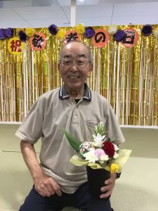 前々からレクの時間に準備してきた飾りつけやフラワーアレンジメントを使用して記念撮影もしました。